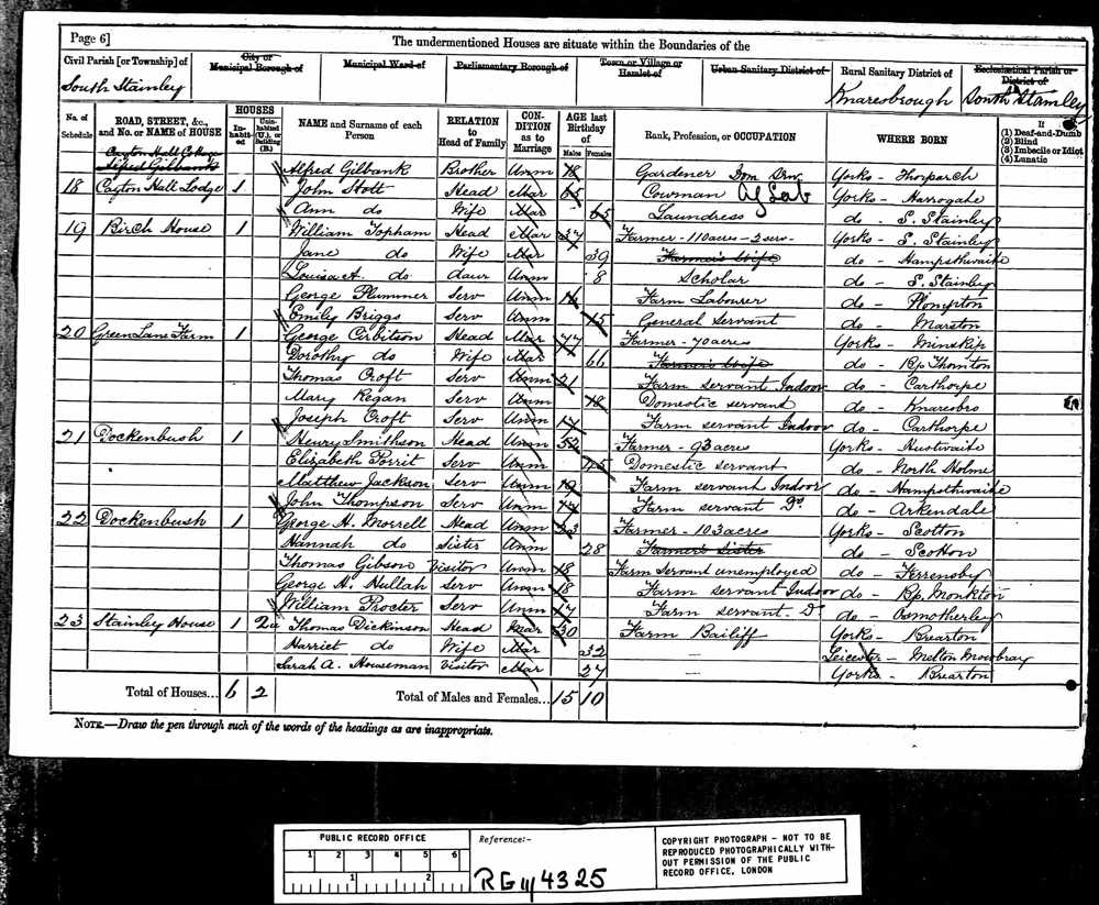 | UK Census - April 1881 - Stainley House, South Stainley, Yorkshire with Thomas & Harriet Dickinson |