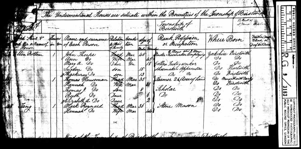 | 6 | 1861-2 | Thomas | Houseman | Head | 1825 | Menwith with Darley, Yorkshire | 35 | Male | Married | | | | Farmer of 24 acres | | | | | | 7 | 1861-2 | Hannah | Houseman | Wife | 1830 | Birstwith, Yorkshire | 31 | Female | Married | | | | | | | | | | 8 | 1861-2 | Thomas James | Houseman | Son | 1853 | Birstwith, Yorkshire | 8 | Male | | | | | Scholar | | | | | | 9 | 1861-2 | Ruth | Houseman | Daughter | 1855 | Birstwith, Yorkshire | 6 | Female | | | | | Scholar | | | | | | 10 | 1861-2 | Elizabeth Anne | Houseman | Daughter | 1858 | Birstwith, Yorkshire | 2 | Female | | | | | | | | | |