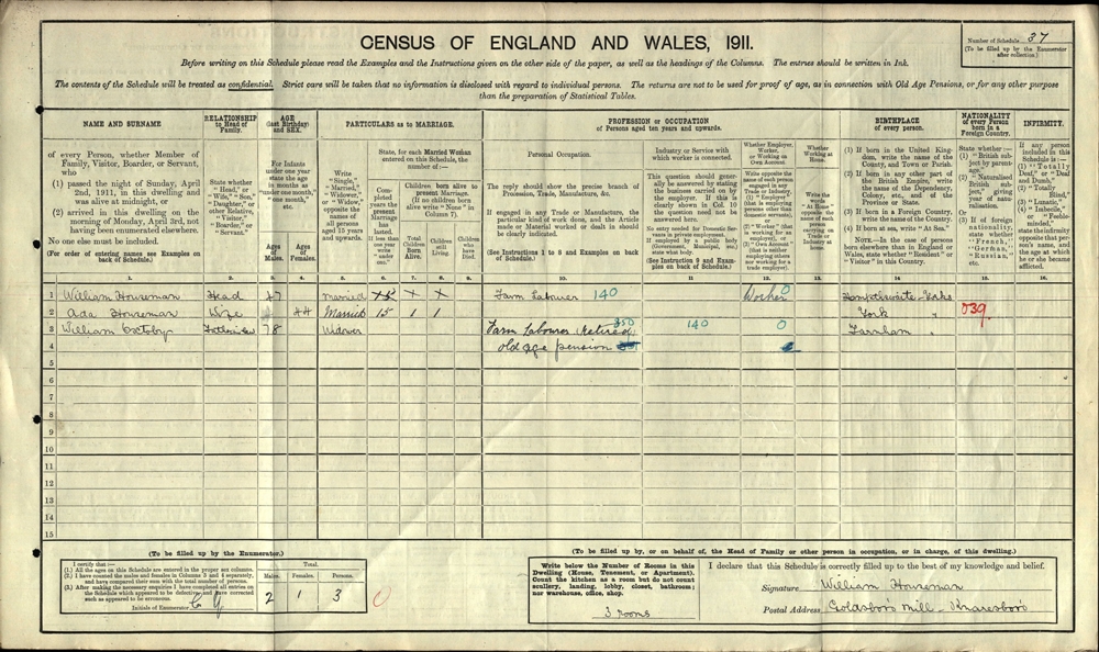 | 1 | 1911-7 | William | Houseman | Head | 1864 | Hampsthwaite, Yorkshire | 47 | Male | Married | 15 | | | Farm Labourer | | | | | | 2 | 1911-7 | Ada | Houseman | Wife | 1867 | York, Yorkshire | 44 | Female | Married | | 1 | 1 | | | | | | | 3 | 1911-7 | William | Oxtoby | Father-in-law | 1833 | Farnham, Yorkshire, England | 78 | Male | Widowed | | | | Pensioner | | | | |