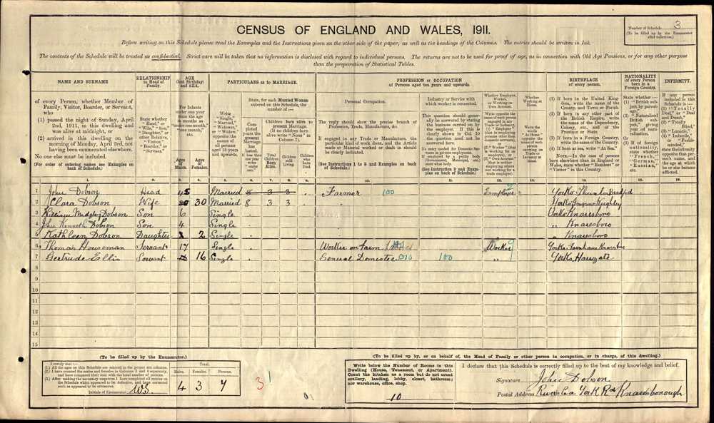 | 1 | 1911-3 | John | Dobson | Head | 1869 | Thornton Bradfred, Yorkshire, England | 42 | Male | Married | | | | Farmer | | | | | | 2 | 1911-3 | Clara | Dobson | Wife | 1881 | Ingrow Keighley, Yorkshire, England | 30 | Female | Married | | | | | | | | | | 3 | 1911-3 | William Medgley | Dobson | Son | 1905 | Knaresboro, Yorkshire, England | 6 | Male | Single | | | | | | | | | | 4 | 1911-3 | John Kenneth | Dobson | Son | 1907 | Knaresboro, Yorkshire, England | 4 | Male | Single | | | | | | | | | | 5 | 1911-3 | Kathleen | Dobson | Daughter | 1909 | Knaresboro, Yorkshire, England | 2 | Female | Single | | | | | | | | | | 6 | 1911-3 | Thomas Edward | Houseman | Servant | 1894 | Farnham, Knaresborough | 17 | Male | Single | | | | Worker On Farm | | | | | | 7 | 1911-3 | Gertrude | Ellis | Servant | 1895 | Harrgate, Yorkshire, England | 16 | Female | Single | | | | Domestic General | | | | |