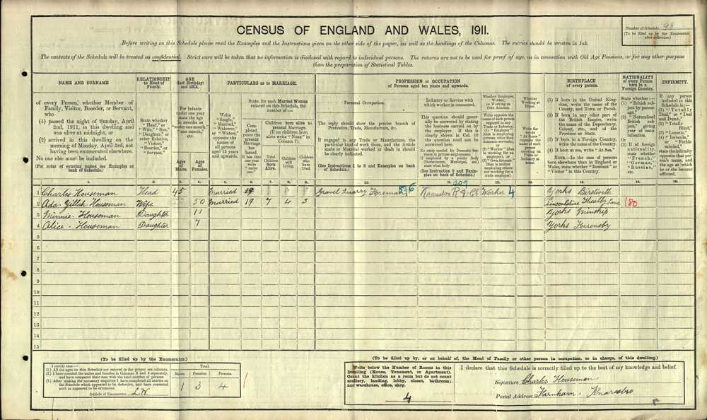 | 1 | 1911-2 | Charles | Houseman | Head | 1865 | Birstwith, Yorkshire | 45 | Male | Married | 19 | 7 | 4 | Gravel Quarry Foreman | | | | | | 2 | 1911-2 | Ada Zillah | Houseman | Wife | 1861 | Thealby , Linconlshire | 50 | Female | Married | | | | | | | | | | 3 | 1911-2 | Minnie | Houseman | Daughter | 1899 | Minskip, Yorkshire | 11 | Female | | | | | | | | | | | 4 | 1911-2 | Alice | Houseman | Daughter | 1904 | Ferrensby, Yorkshire | 7 | Female | | | | | | | | | |