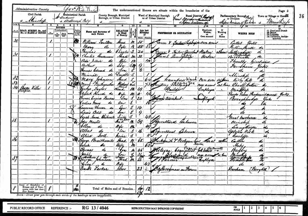 | 4 | 31 | Charles | Houseman | Head | 1865 | Birstwith, Yorkshire | 35 | Male | Married | | | | Gravel Quarryman | | | | | | 5 | 31 | Ada Zillah | Houseman | Wife | 1861 | Thealby, Lincolnshire | 40 | Female | Married | | | | | | | | | | 6 | 31 | Arthur | Houseman | Son | 1891 | Farnham, Yorkshire | 9 | Male | | | | | | | | | | | 7 | 31 | Thomas Edward | Houseman | Son | 1894 | Farnham, Yorkshire | 6 | Male | | | | | | | | | | | 8 | 31 | Minnie | Houseman | Daughter | 1899 | Minskip, Yorkshire | 1 | Female | | | | | | | | | |