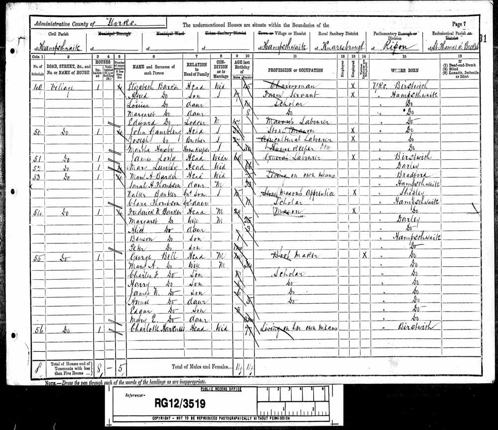 | UK Census - April 1891 - Hampsthwaite, Yorkshire |