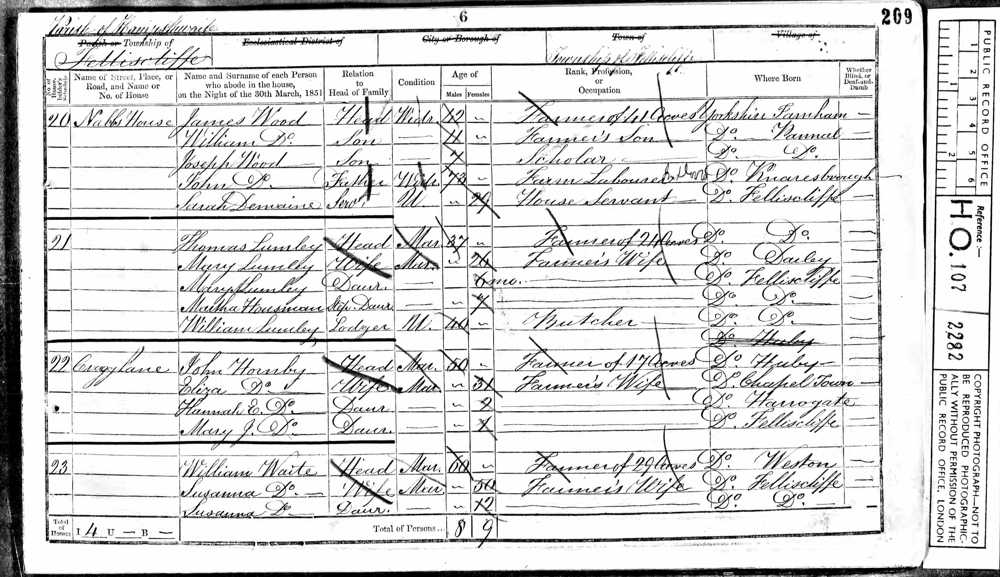 | 6 | 1851-3 | Thomas | Lumley | Head | 1810 | Felliscliffe, Yorkshire | 37 | Male | Married | | | | Farmer of 24 acres | | | | | | 7 | 1851-3 | Mary | Lumley | Wife | 1825 | Darley, Yorkshire | 26 | Female | Married | | | | | | | | | | 8 | 1851-3 | Mary Ann | Lumley | Daughter | 1850 | Felliscliffe, Yorkshire | 6 Mo | Female | | | | | | | | | | | 9 | 1851-3 | Martha | Houseman | Stepdaughter | 1843 | Felliscliffe, Yorkshire | 7 | Female | | | | | | | | | | | 10 | 1851-3 | William | Lumley | Lodger | 1811 | Felliscliffe, Yorkshire, England | 40 | Male | | | | | | | | | |