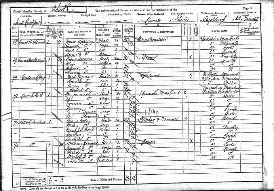 | 1 | 91-08 | James | Appleby | Head | 1863 | Dacre Banks, Yorkshire | 28 | Male | Married | | | | Police Constable | | | | | | 2 | 91-08 | Hannah | Appleby | Wife | 1859 | Felliscliffe, Yorkshire | 32 | Female | Married | | | | | | | | | | 3 | 91-08 | Fred L | Appleby | Son | 1887 | Hook, Yorkshire | 4 | Male | | | | | | | | | | | 4 | 91-08 | Annie E | Appleby | Daughter | 1890 | Cowick, Yorkshire | 9/12 | Female | | | | | | | | | |