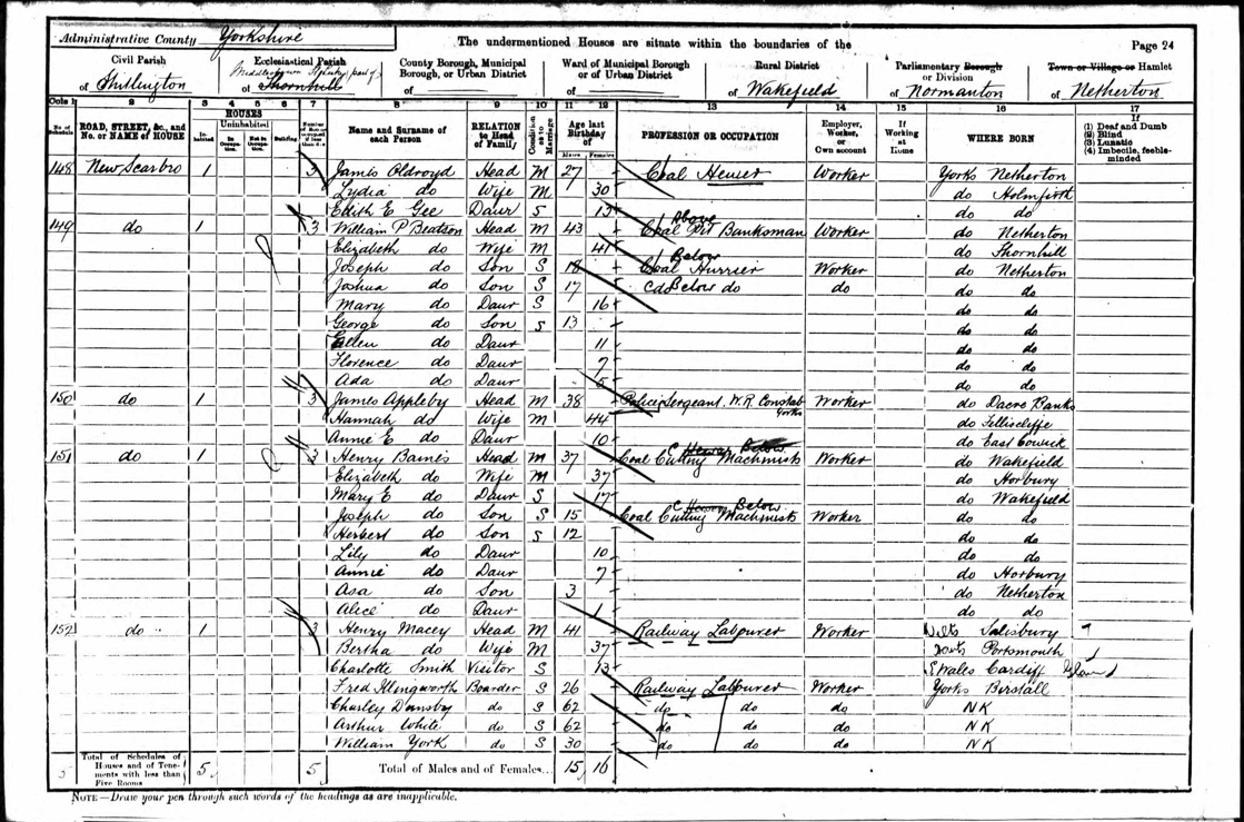 | 13 | 150 | James | Appleby | Head | 1863 | Dacre Banks, Yorkshire | 38 | Male | Married | | | | Police Sergeant | | | | | | 14 | 150 | Hannah | Appleby | Wife | 1857 | Felliscliffe, Yorkshire | 44 | Female | Married | | | | | | | | | | 15 | 150 | Annie E | Appleby | Daughter | 1891 | East Cowick, Yorkshire | 10 | Female | | | | | | | | | |