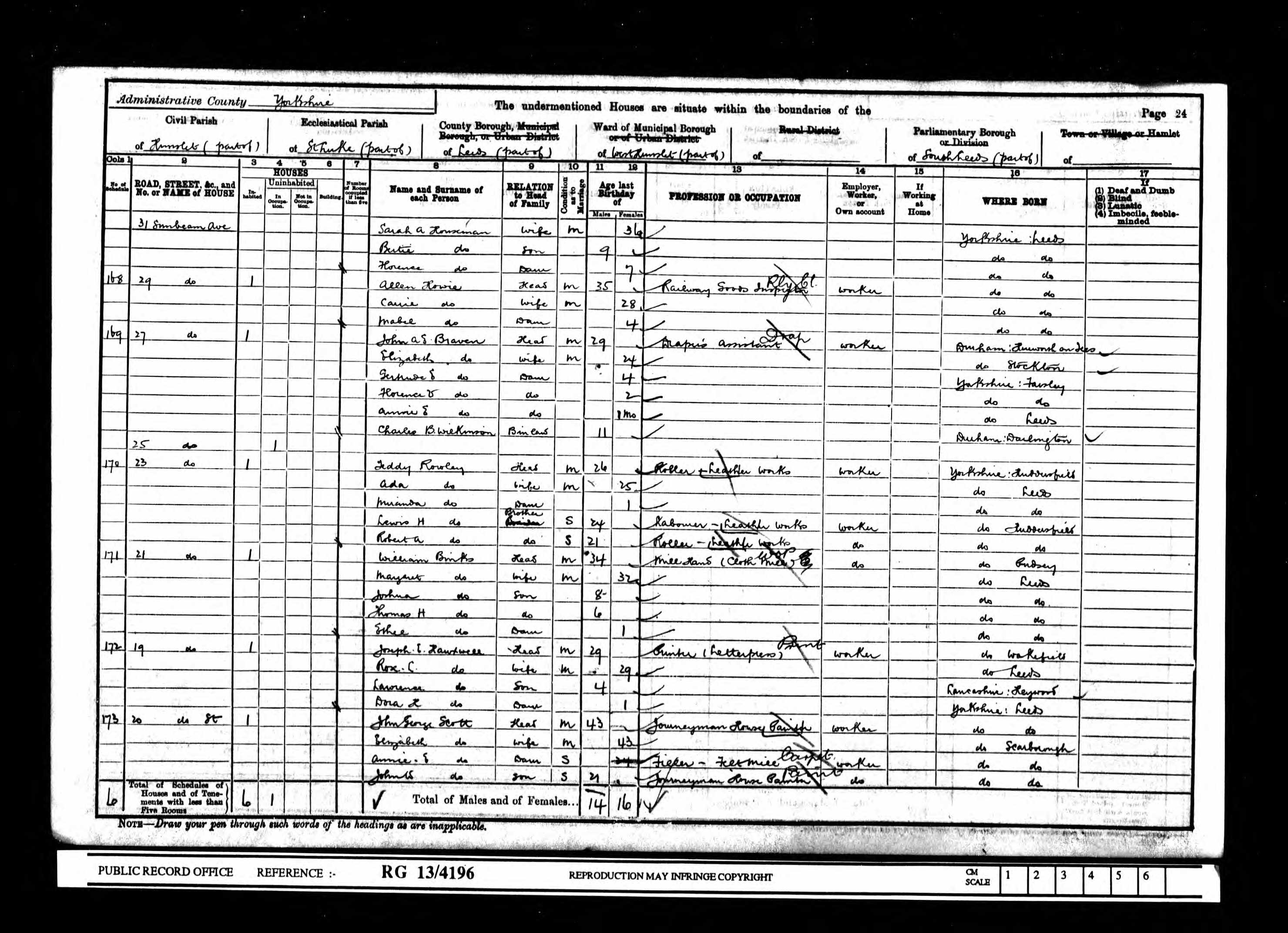 | UK Census - April 1911 - 20 Sefton Street, Beeston Hill, Leeds, Yorkshire |