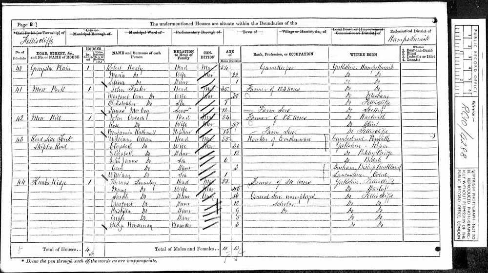 | UK Census - April 1871 - Knabs Ridge, Felliscliffe, Yorkshire with Uncle & Aunt Thomas & Mary ( Houseman ) Lumley |