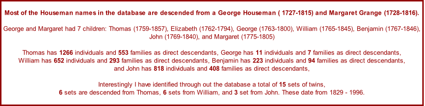 Whilst the information in this database comes directly from my Houseman databases, it is YOUR database as it incorporates not only my own research but also information from the many people that I have been in contact with over the past 7 years, as well as information published on the internet and elsewhere.